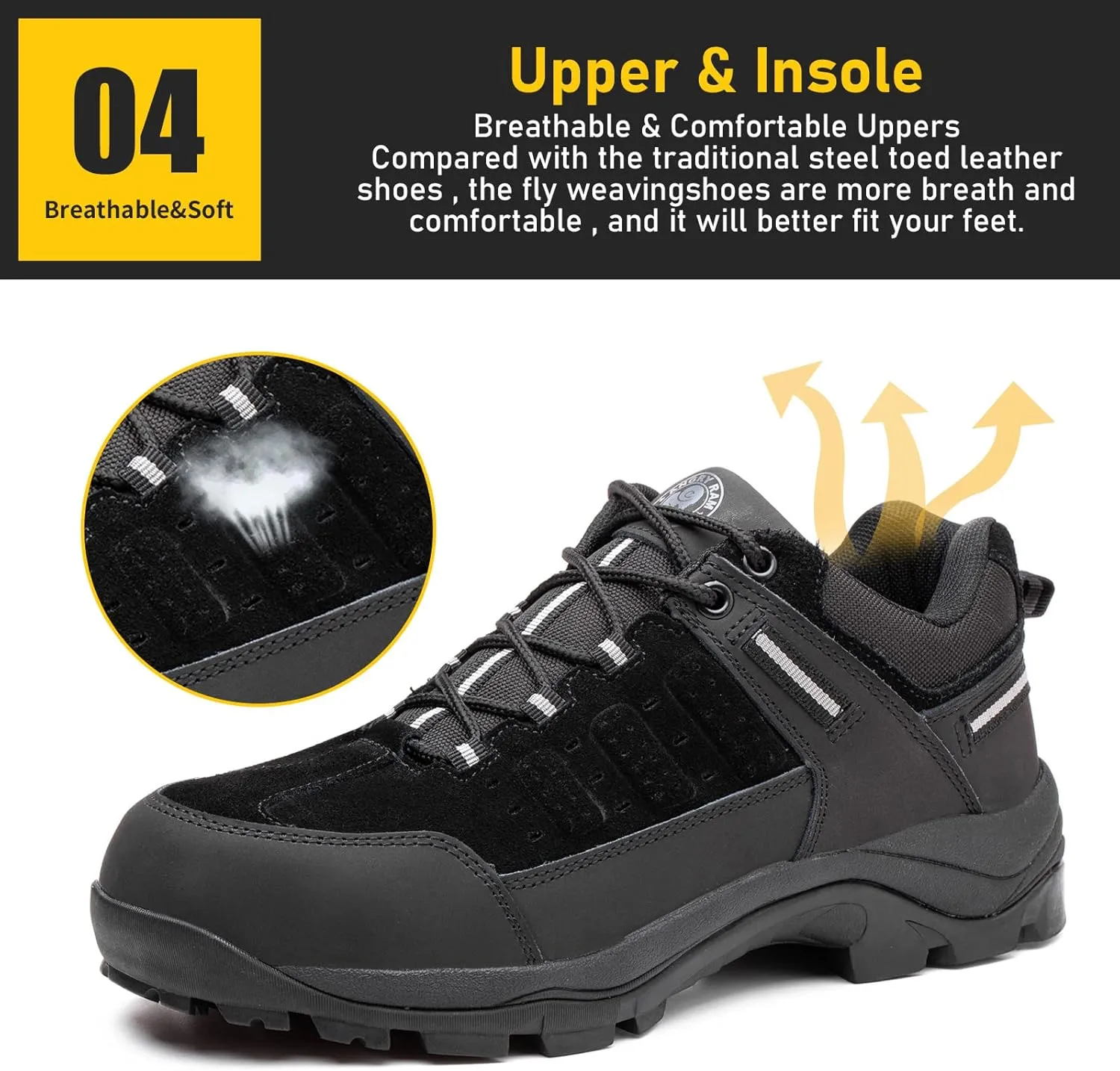 - [Lightweight & Breathable Upper]Compared with traditional steel toe shoes,ANGRYRAM safety work shoes use fly woven material,which helps to be more comfortable and breathable.The steel toe sneakers