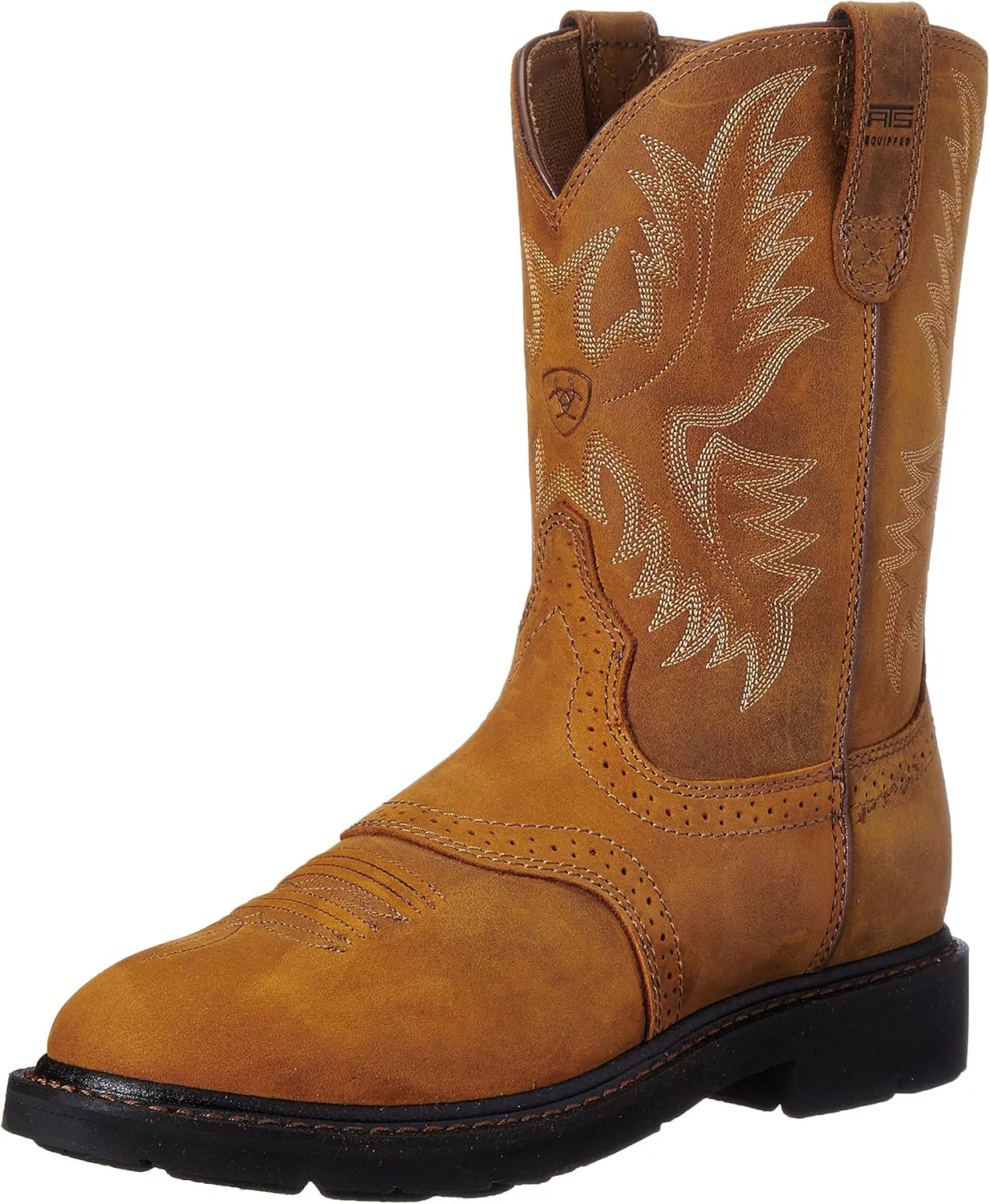 The Sierra Saddle Work Boot by Ariat is ready to join you in your next workplace endeavor. This classic western boot combines the durability of premium full-grain leather that keeps your foot protected with the lovely 6-row stitching detail for a timeless western style. It features a gel-cushioned insole with heel stabilizer and is designed with Ariats exclusive ATS technology for stability and all-day comfort. This advanced technology leads to lower fatigue and less strain on the joints of your feet. Designed with heavy-duty oil- and slip-resisting Duratread outsole, these pull-on work boots are complete with Goodyear welt construction for added durability. Its high heat-resistant outsole is suitable for the most demanding workplaces, complete a with ASTM F2413-18 M I/C EH rated safety toe and ASTM F2892-11 EH rated soft toe, making it perfect for railroad welding work and other high heat environments (tested to 750-degree Farenheit/400-degree Celsius).