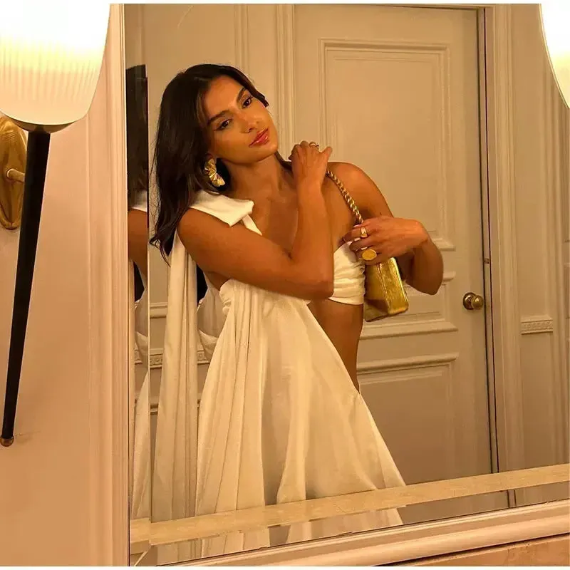 This elegant asymmetrical one-shoulder mini dress is crafted from smooth satin, exuding timeless sophistication and charm. The unique design features a twisted bandeau-style top with a cutout detail, enhancing the silhouette with a bold yet refined aesthetic.