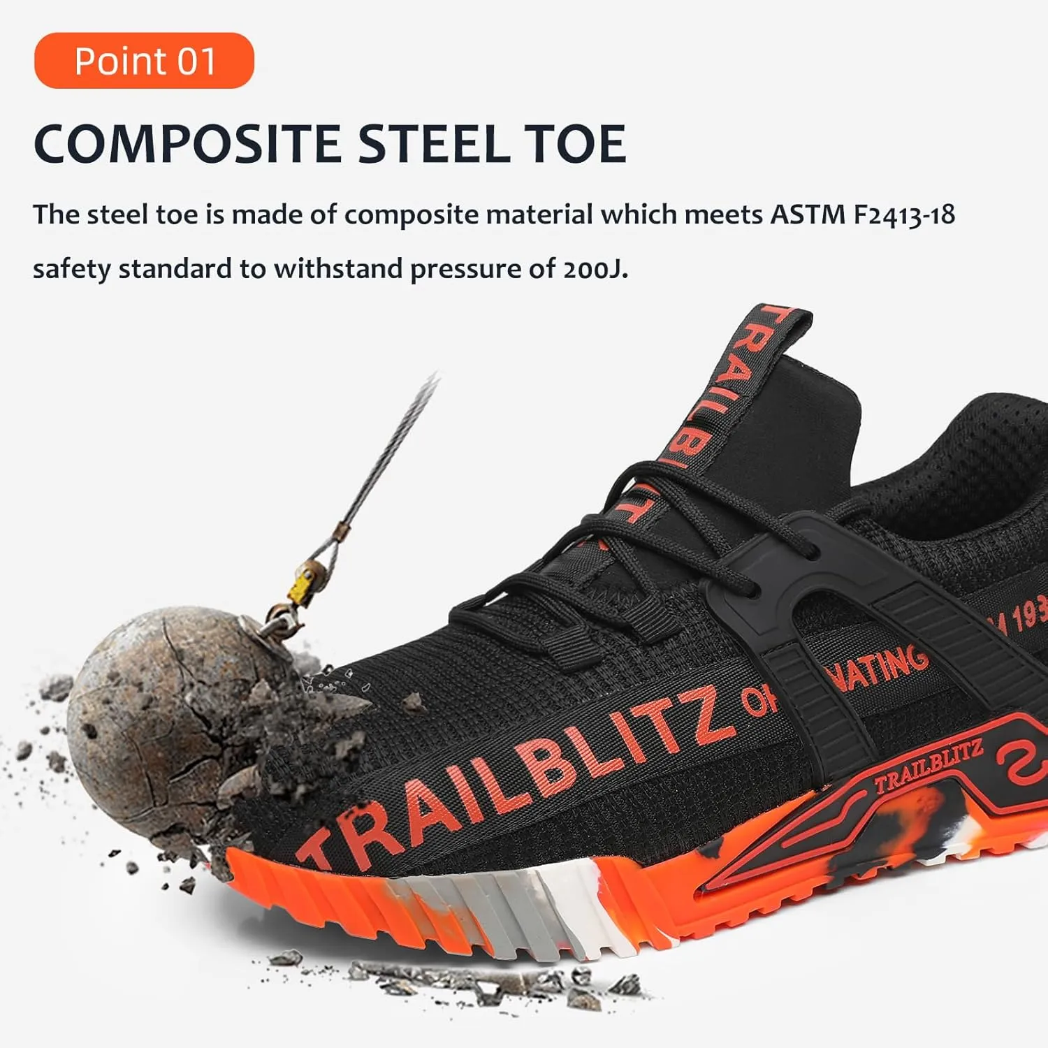 - LIGHTWEIGHT BREATHABLE: Composite steel toe and mesh upper make the work sneakers more lightweight and breathable, giving you wonderful wearing experience.