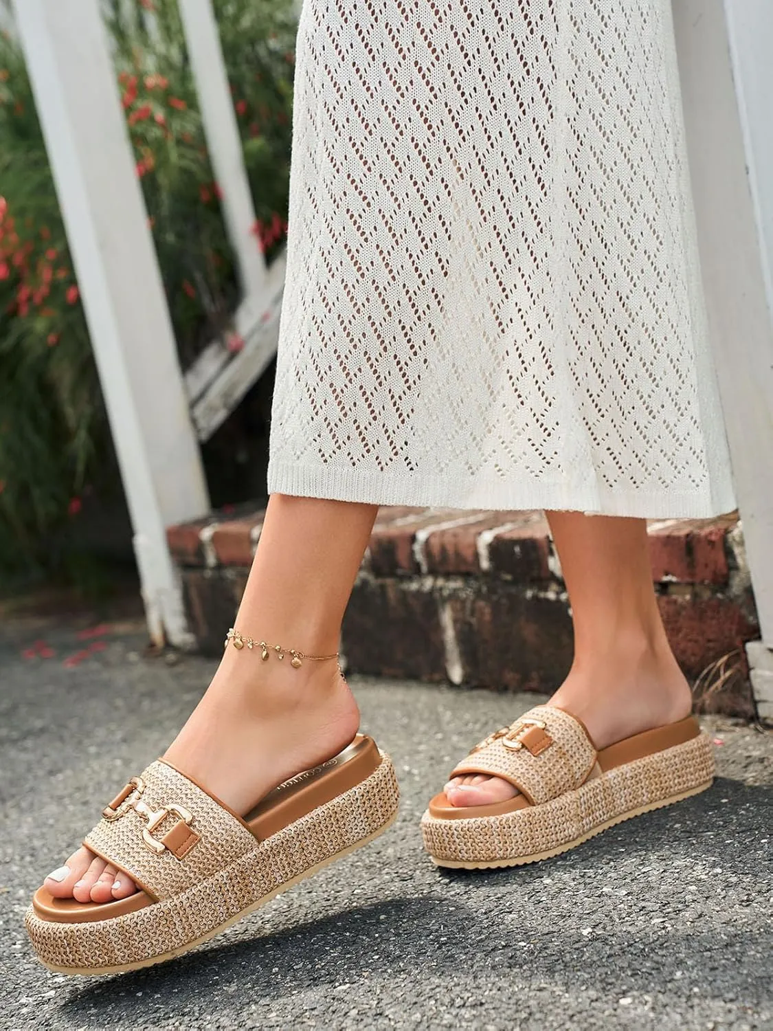 Coutgo Womens Platform Sandals Raffia Espadrilles Metal Chain Slip on Open Toe Cute Beach Slide Sandals