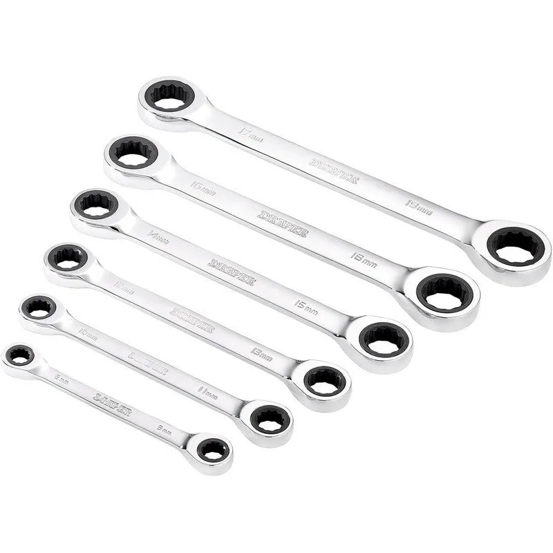 These Draper HI-TORQ® metric double ring ratchet spanners are forged from chrome vanadium steel that is hardened, tempered, fully polished and mirror chrome plated for corrosion protection. Both ring ends have a 90-tooth ratchet mechanism, and the 4° movement enables use in tight spaces. The 12-point HI-TORQ® delivers maximum leverage by transferring torque to the flats and preventing slipping or damage to the fastener. This six-piece set contains the full range.