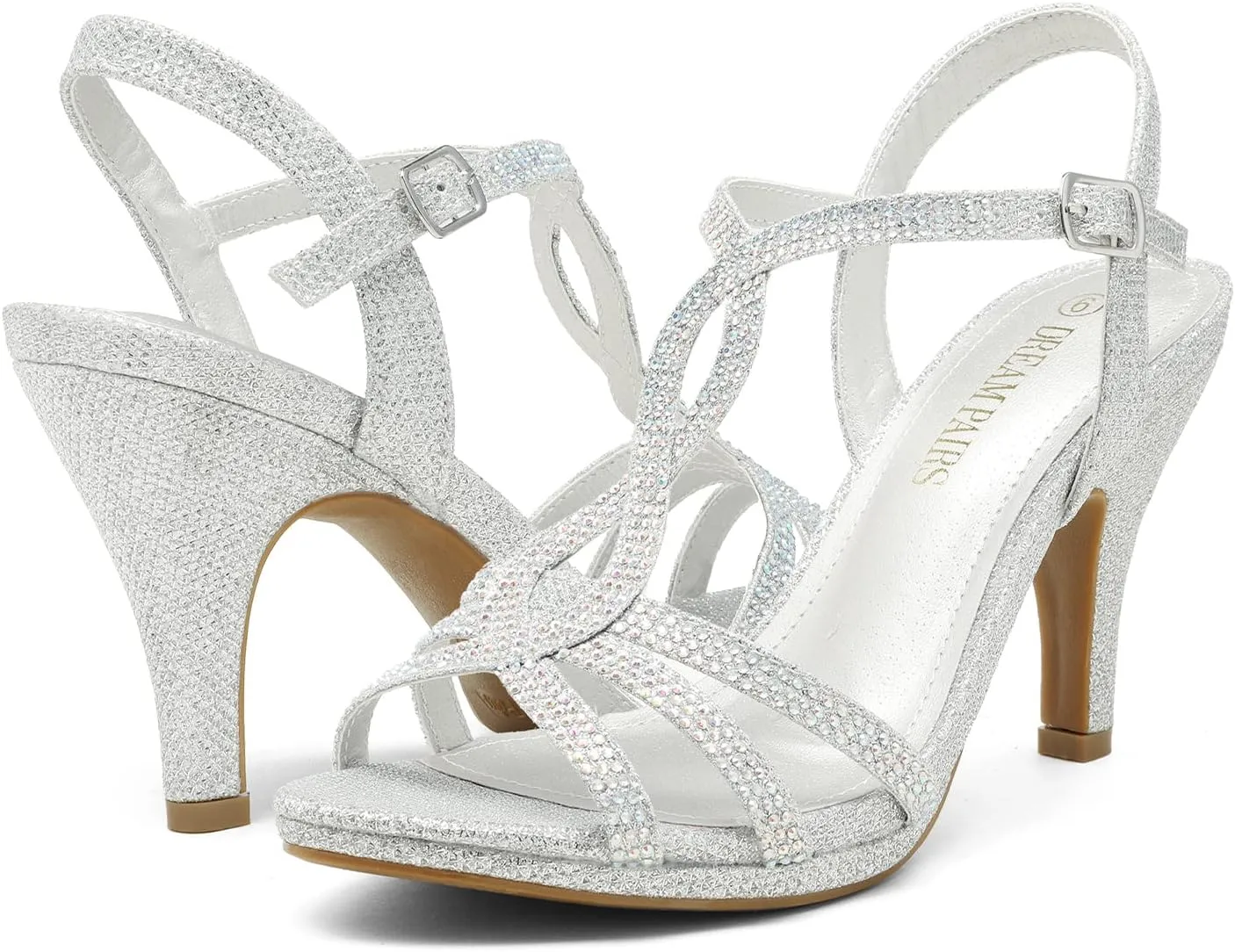 Give any dress an elegant look with these adorable high heels! Featuring shining rhinestones upper with metallic leatherette upper, crossed strap design with adjustable buckle closure, open toe, platform, stiletto heel, and lightly padded insole.