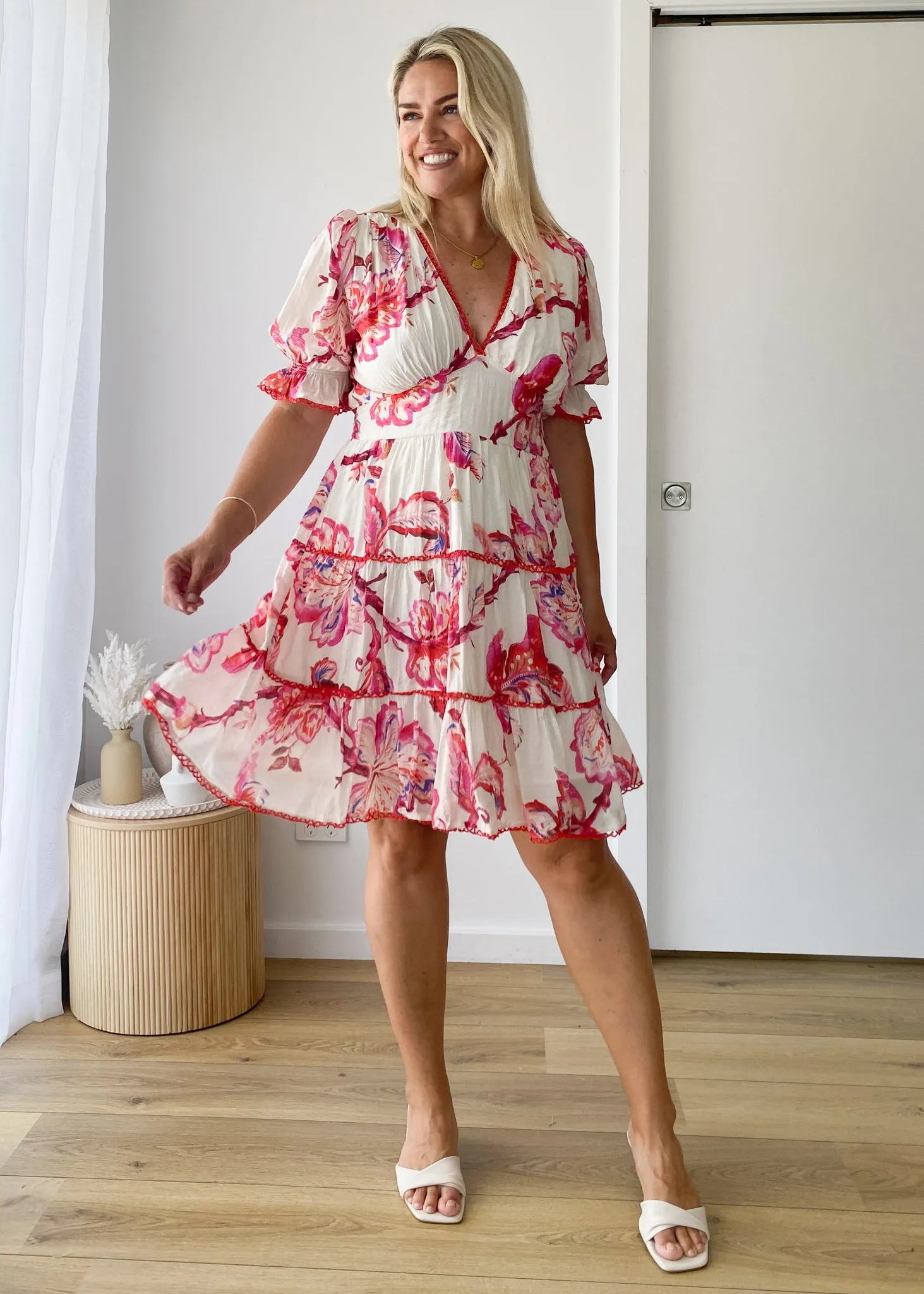 Bold and elegant, the Eclipse Dress in Red Floral is a display of fiery sophistication. The vibrant red base accented with intricate floral details makes a bold statement, perfect for evening gatherings and upscale events. Its refined style exudes drama and allure, ensuring you stand out wherever you go. Amplify the dress's vibrant charm with black or gold stilettos and a matching clutch. Opt for statement jewellery like gold hoops and style your hair in a sleek bun to highlight the dramatic flair of this stunning piece.