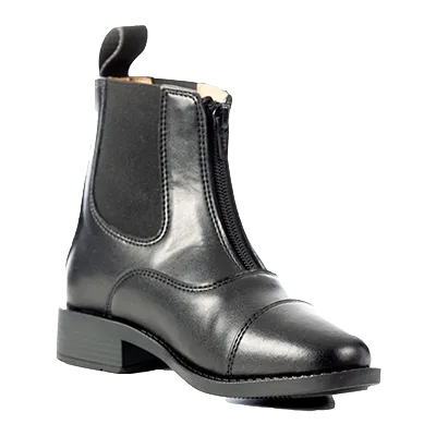 Equinavia Tilda Kids Synthetic Zip Paddock Boots offer young riders style, comfort, and affordability. These paddock boots are tailored for growing feet and budget-friendly. Fully lined with perforated PU lining, these boots ensure airflow for cool, comfortable wear during long rides. With a classic rubber molded sole, they deliver durability and traction. The EVA molded footbed provides cushioning and support for stability. Elastic gussets ensure a snug ankle fit, ideal for pairing with half chaps. Featuring a built-in spur rest and nylon pull tag, these boots are easy to wear and remove, perfect for young riders. The heavy-duty YKK metal zipper ensures reliable closure and lasting performance.