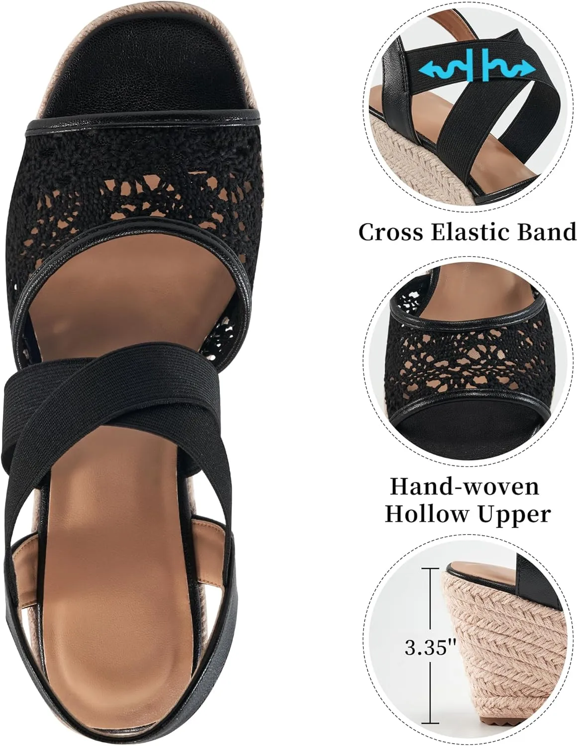 • Design: Wedge sandals for women with reasonable wedge structure support design perfectly fits the feet, bringing walking comfort. A slip-on fit with criss-cross elastic straps flexes to your foot, making the shoe more comfortable, charming, and easy to put on and take off