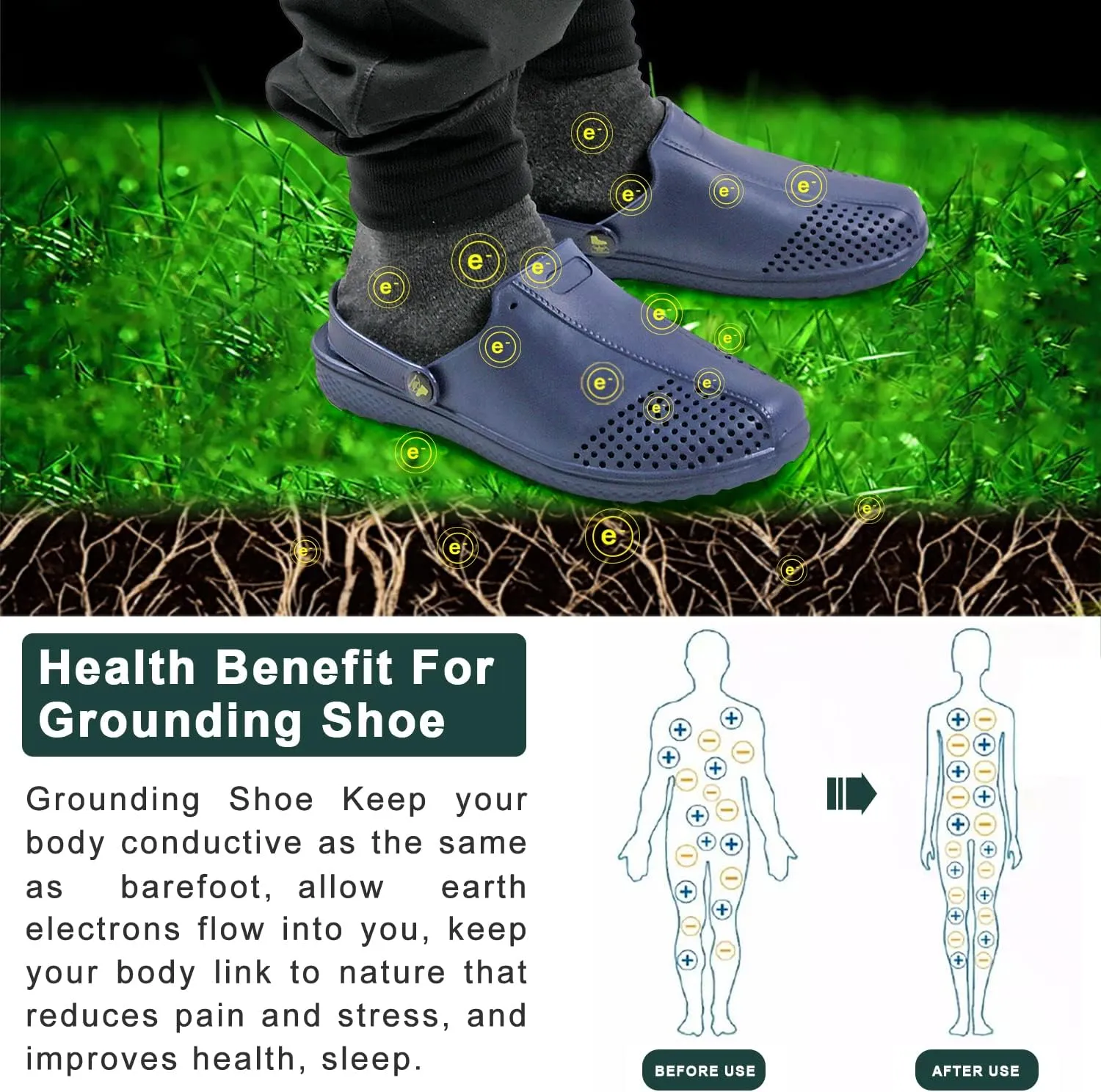 - Conductive Elements- The oval-shaped conductive pad we use in the sole acts as a conductor of electron flow from the earth to your body. It makes our clogs genuinely grounding.