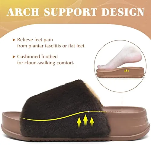 - ▶▶ADJUSTABLE & EASY SLIP ON/OFF: woman fur slides sandals with double micro suede straps is nice and snug, easy to walk in and stay on feet. Specially designed for high instep, narrow and wide feet. Also good for people that have had foot surgeries.