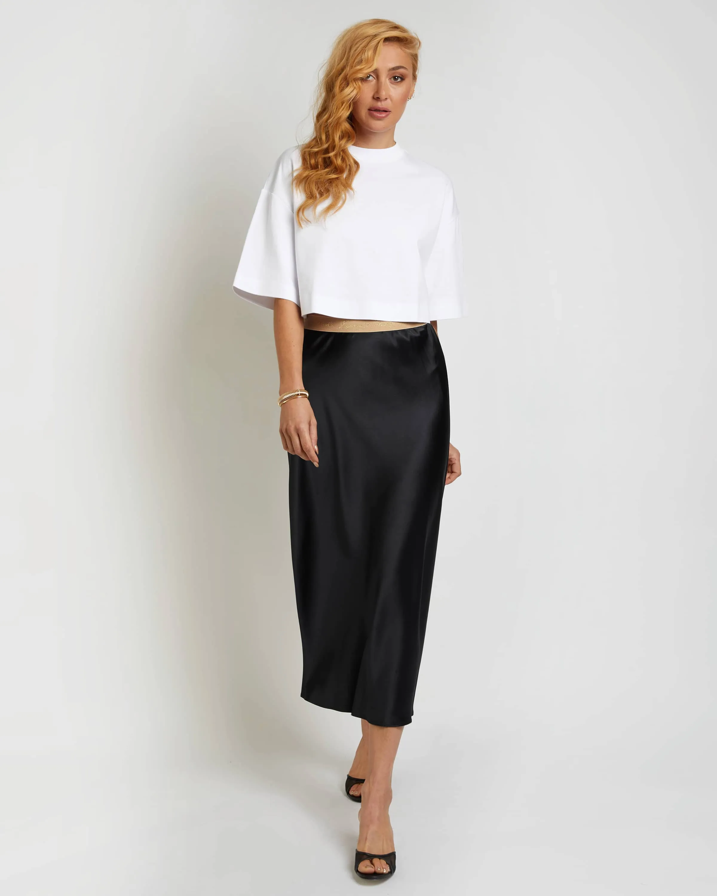 Maxou is our tribute to the multirole woman. Luxurious 100% Silk fabrication drapes beautifully for a glorious polished look with an easy slip on construction for day to night ease. Reversible design for expanding possibilities from Sand to Black. The confidence of a woman is recognized most when she is in her element, expressive and in a state of joy. Maxou blends opulence and class with modernity, perfect for combining with ballet flats for musing, heels for bold evenings or a sandal for an unexpected ocean side vacation. An essential for every closet.