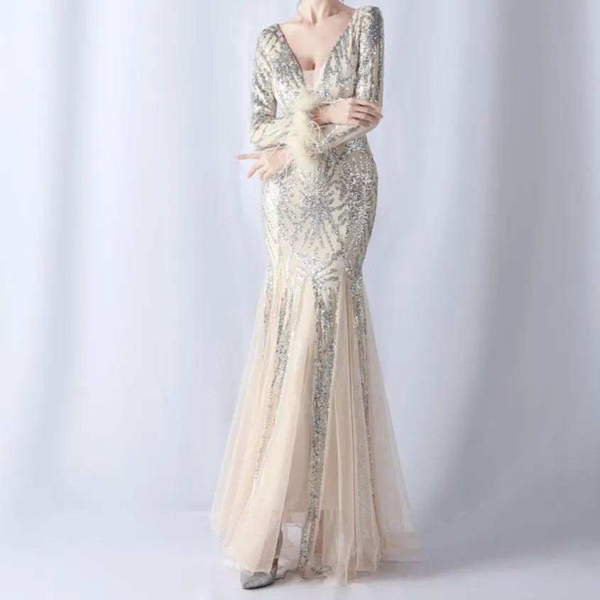 • Beaded Accents: In addition to the sequins, the dress features intricate beading, adding texture and depth to the design. The beads may be strategically placed to enhance the overall pattern or to accentuate certain areas of the dress.