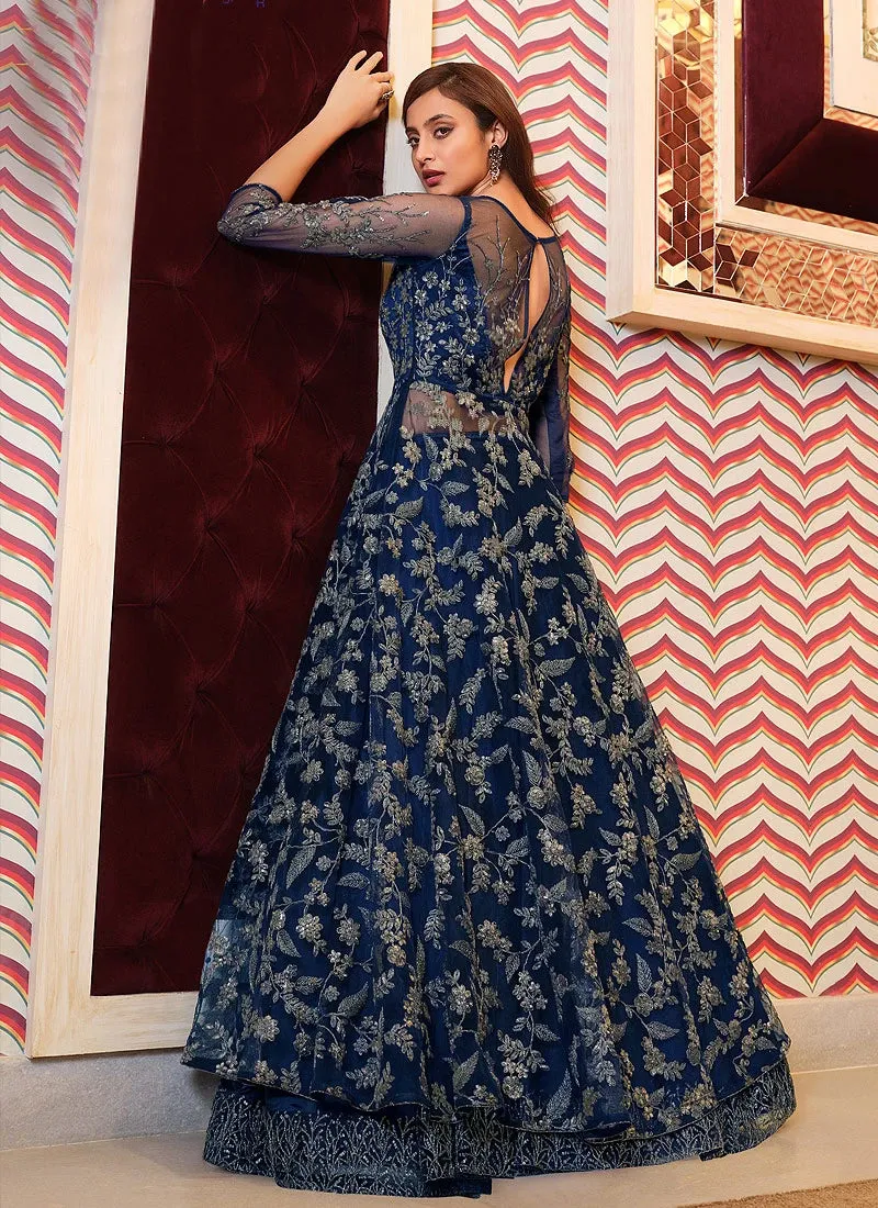This Blue Lehenga Anarkali set comprises of an top, bottom and a dupatta.