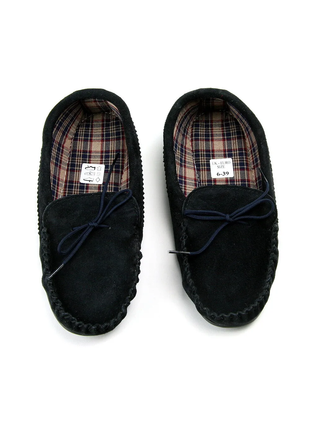 A pair of British made moccasins with a comfy padded plaid pattern fabric lining and robust plastic sole.