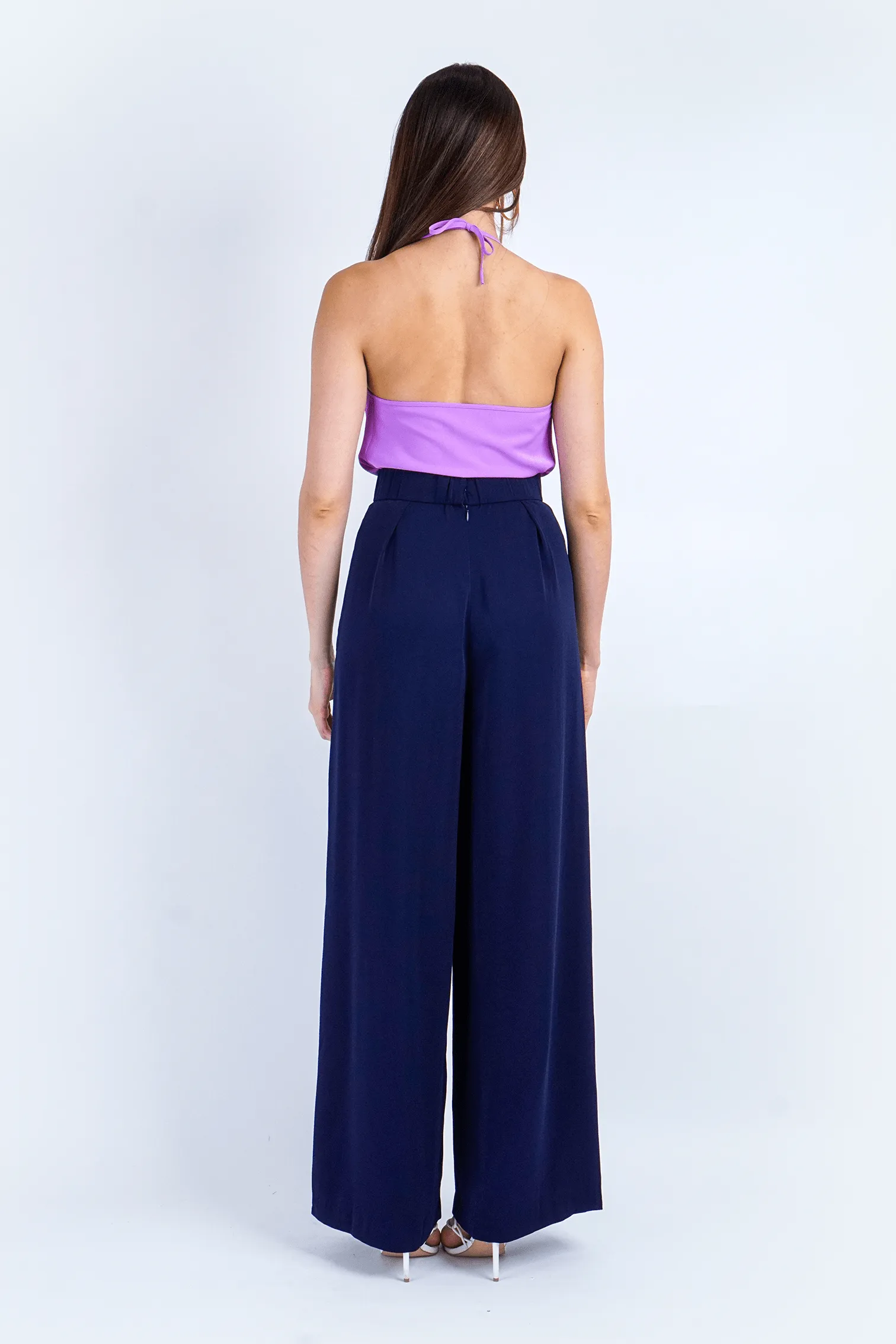 These Navy Pleated High Waist Relaxing Leslie Pants feature a flowy, high-waisted design with hidden side pockets and a front pleat detail. The 2-inch wide waistband and elastic back provide both comfort and a professional look. A center back zipper adds convenience. Complete your outfit by pairing these pants with a stylish shirt and flats for a polished look.