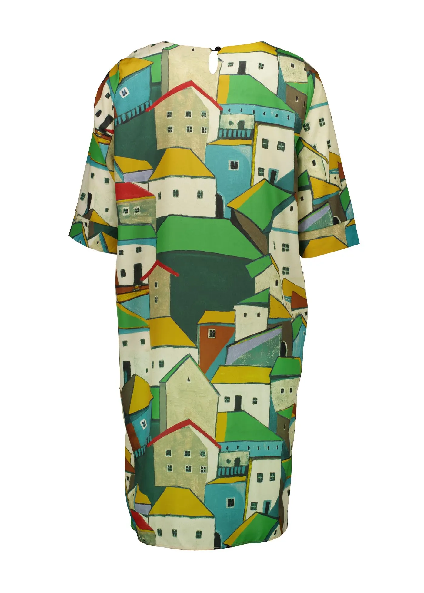 Add a burst of colour and artistry to your wardrobe with the Green Pueblito Sencillo Dress. This playful, bold design, inspired by the vibrant and historic buildings found in Europe’s Romantic countries—Spain, Portugal, and Italy captures the essence of rejuvenated facades that breathe new life into old architecture.