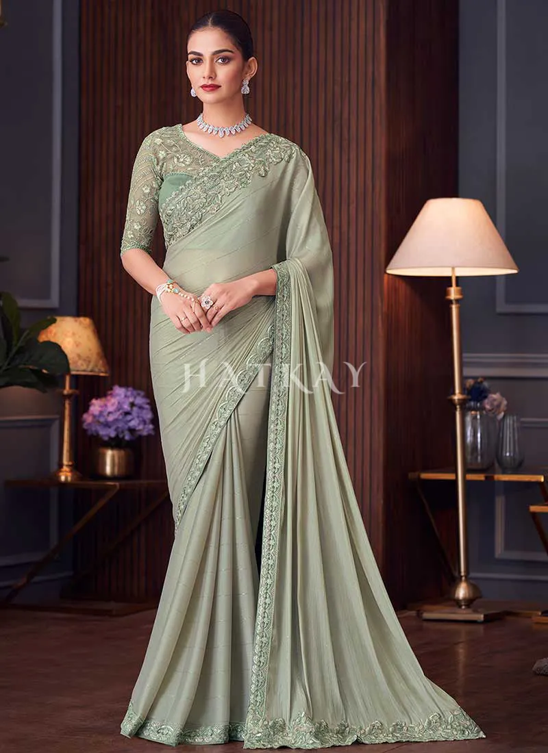 Sage Green Embroidery Designer Saree combines timeless elegance with exquisite craftsmanship, showcasing intricate embroidery detailing. Crafted from premium chiffon silk fabric, this saree offers a graceful drape, perfect for weddings and grand celebrations. The border and pallu are enriched with delicate zari, multi-colored resham threadwork, sequins and beads work for a refined finish. The silk blouse complements the saree with its captivating embroidery patterns and sequins accents on the sleeves, front and back, enhancing its luxurious appeal. Style this saree with bold jewelry and a polished updo to create a breathtaking look for any special occasion.