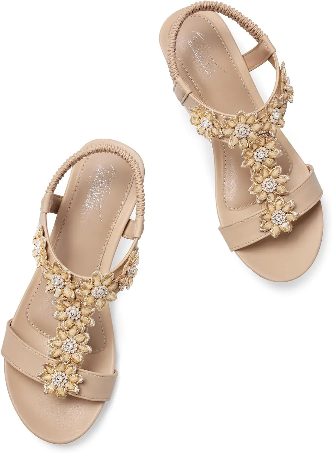 - Elaborate Design: Boho platform wedge samdals for women made of sparkly flower rhinestone. Beige dressy sandals for women with bling glitter pearl jeweled is casual in daily, easy to match. Cute fashion wedge combined with a smooth line design, more stylish and better looking.