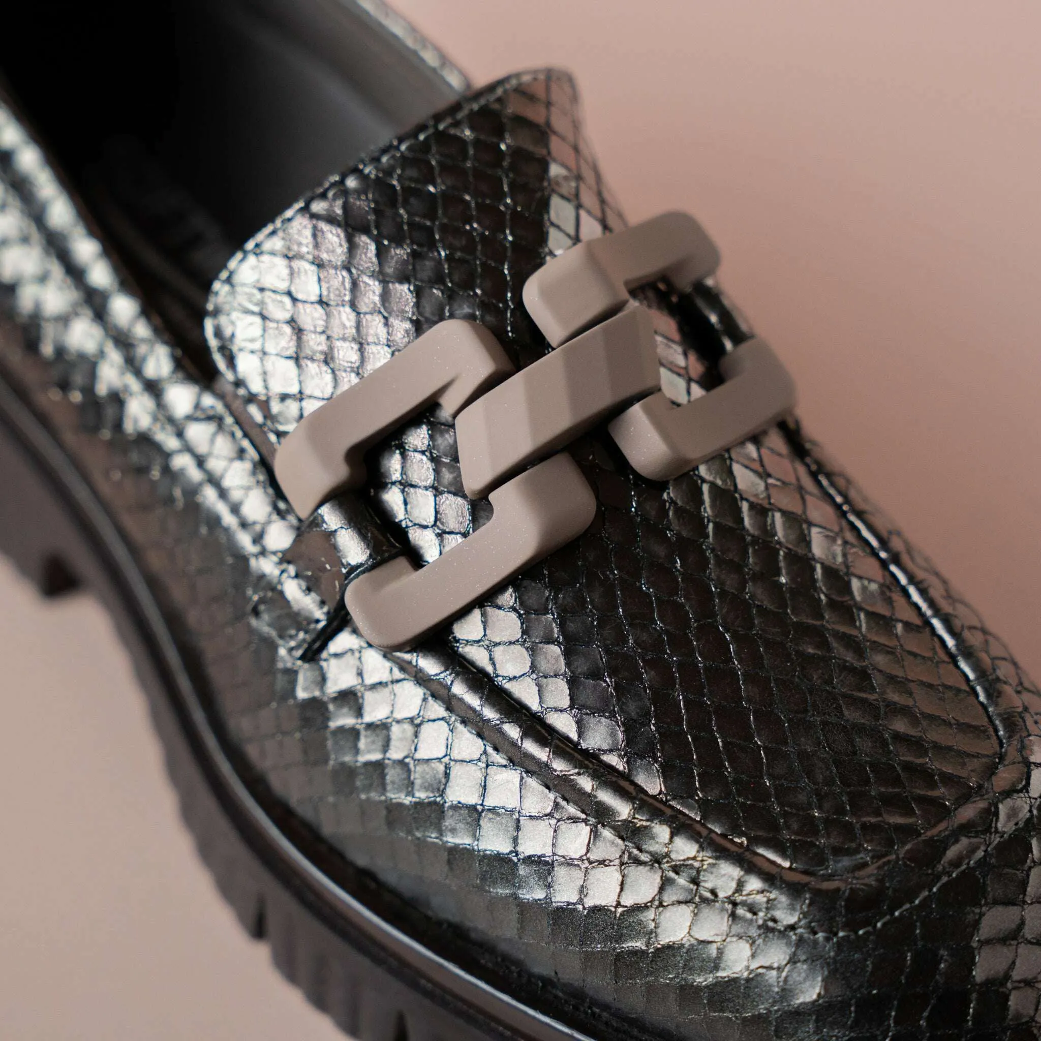 This dynamic pewter loafer in snake printed leather adds a touch of whimsy to the classic loafer. With a lug sole, and a, this stylish loafer also ramps up the comfort.