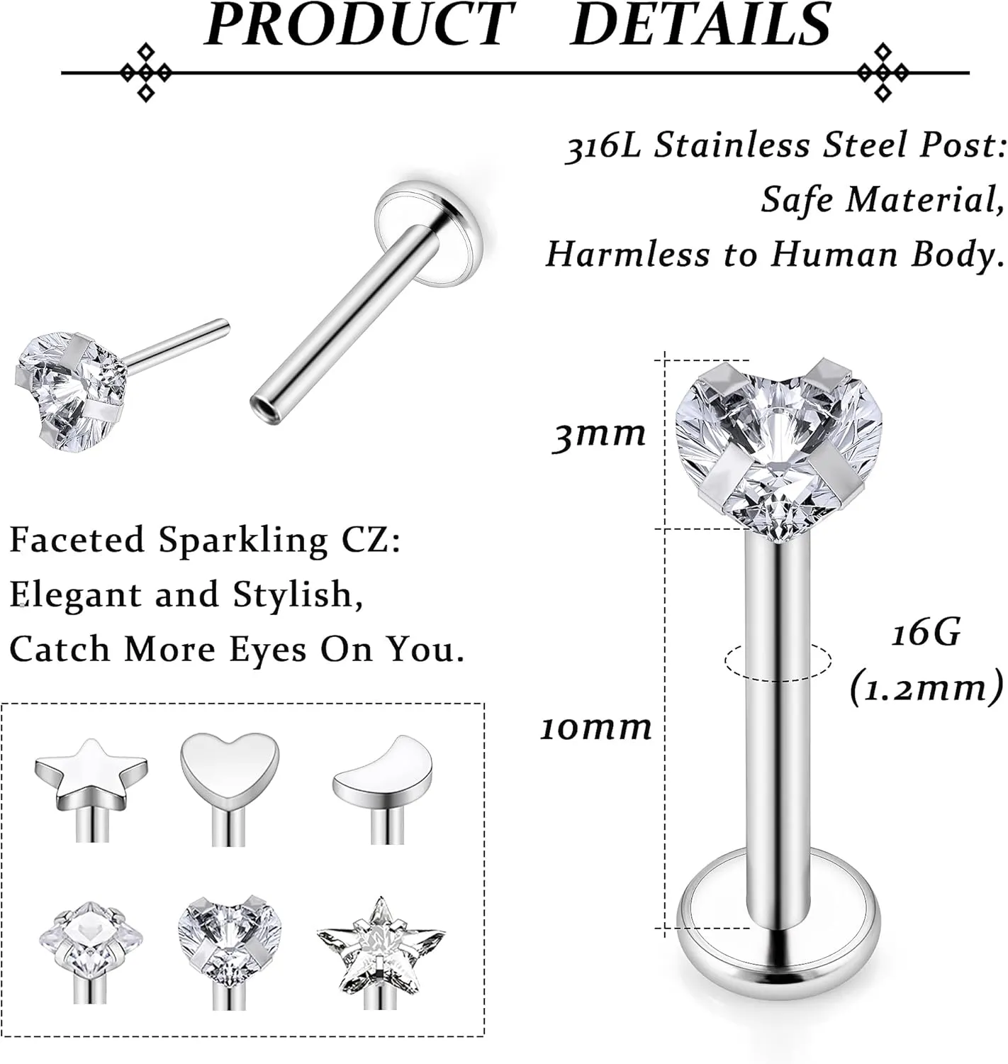 - [ITEM CONTAIN]: You Will Receive 12 Pieces Stainless steel Threadless Push in Flat Back Lip Ring Piercing Jewelry, All Of Them Are Beautiful And Elegant, Multiple Choices For Meeting Your Various Needs.