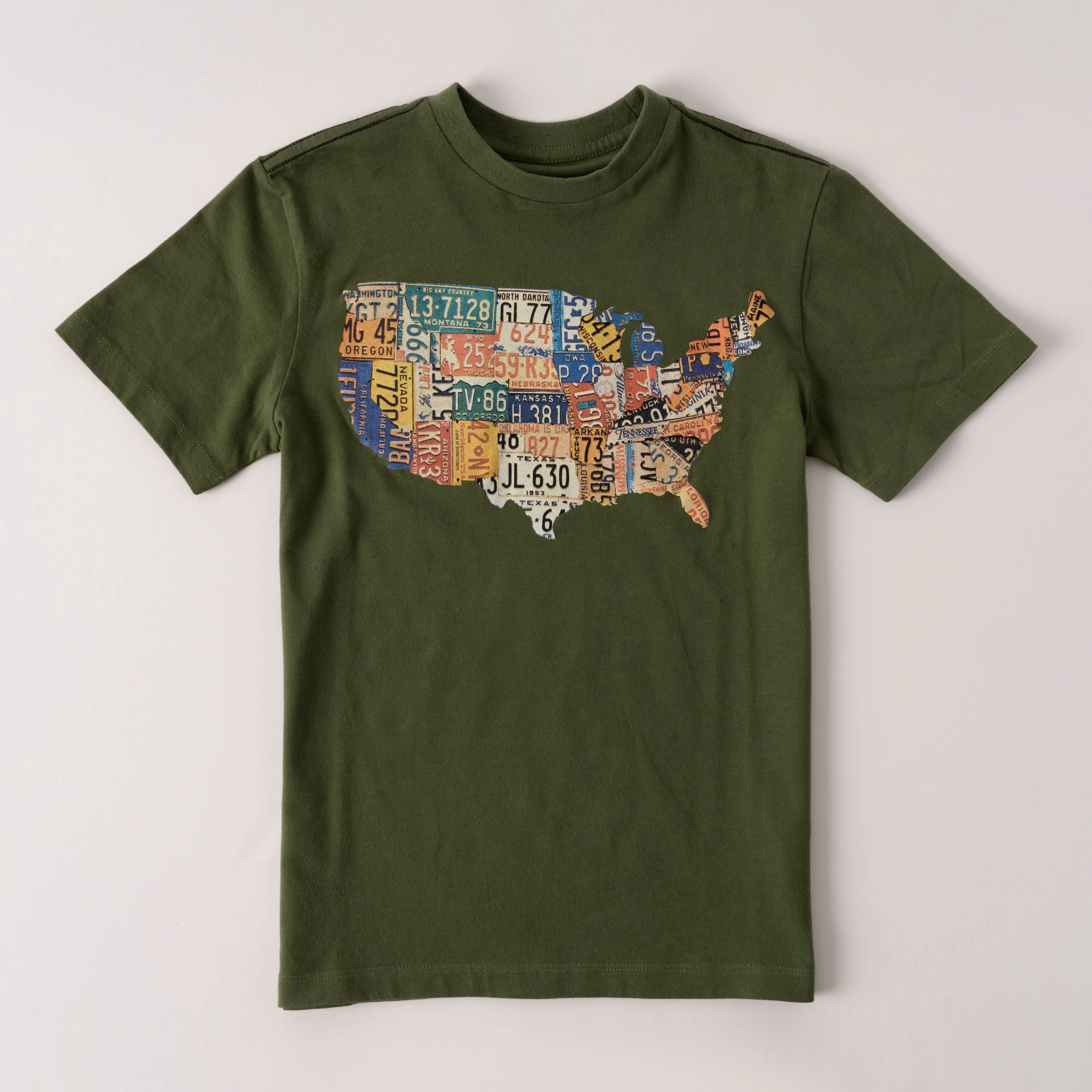 Adventure-ready and stylishly casual, this Kidpik boy's outfit is designed for the young explorer. The outfit features a short sleeve graphic tee in a rich olive green, adorned with a multicolored map of America for a playful yet educational touch. Complementing the tee are canvas camo cargo shorts that are both functional and trendy, equipped with plenty of pockets for storing treasures. A braided camo bracelet adds an extra touch of outdoor style to the ensemble. Completing the look are sturdy brown strap sandals, perfect for active adventures. This Kidpik outfit encapsulates a versatile and fun look perfect for any young adventurer.