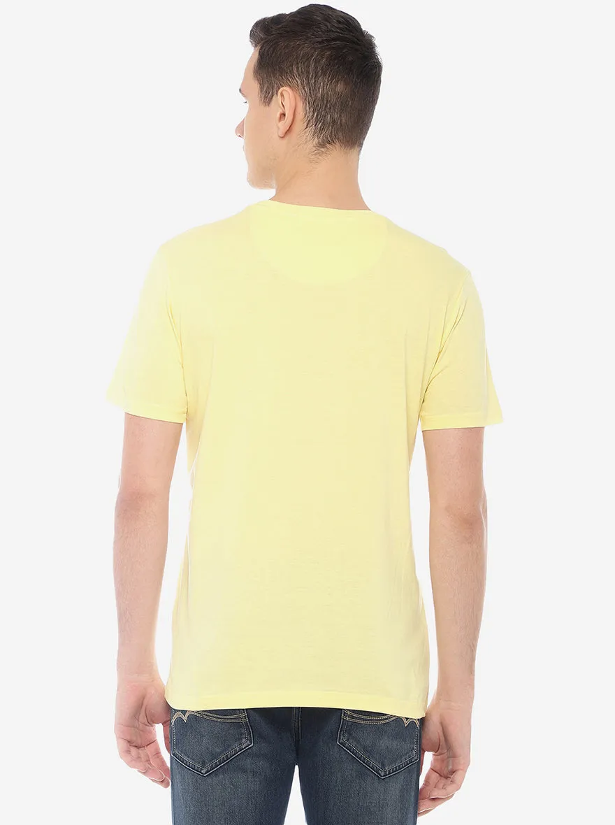 Details: Raise your style quotient in a trendy way by getting ready in this solid yellow T-shirt. Designed by JadeBlue, this slim fit T-shirt is a wardrobe winner for sure, courtesy its skin-friendly cotton fabric and striking features. It is stitched to precision and has certain basic features like round neck, half sleeves, logo in the front and straight hemline. Pair it with comfy black jeans, watch and moccasins to achieve a fabulous casual look in a snap. Invest in this wardrobe staple now and get going in style!